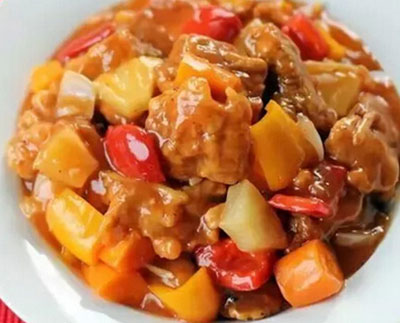 里脊肉半斤多、紅彩椒塊半杯、菠蘿塊1小杯、洋蔥塊1小杯、胡蘿卜塊半杯、面粉1小杯、雞蛋1個